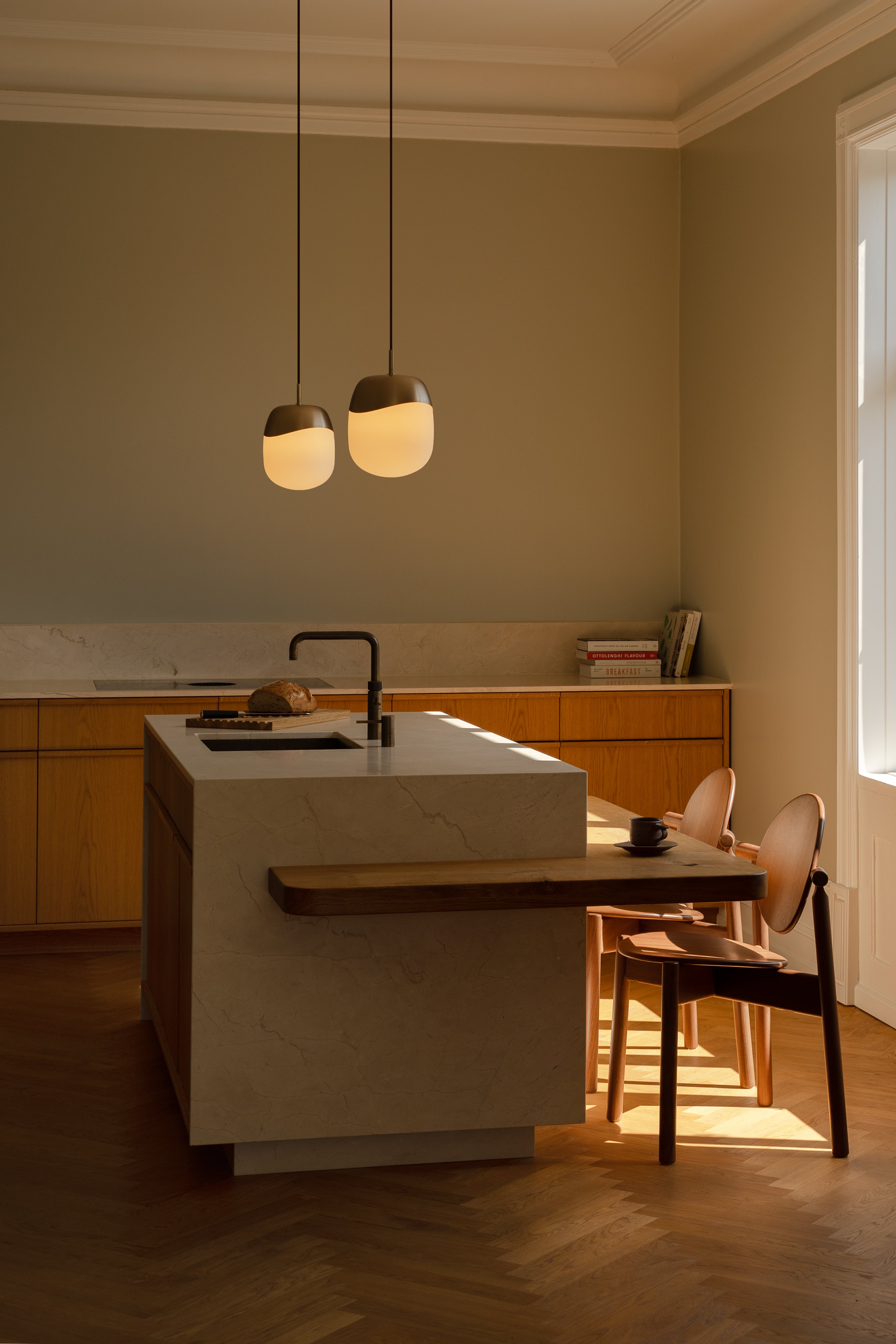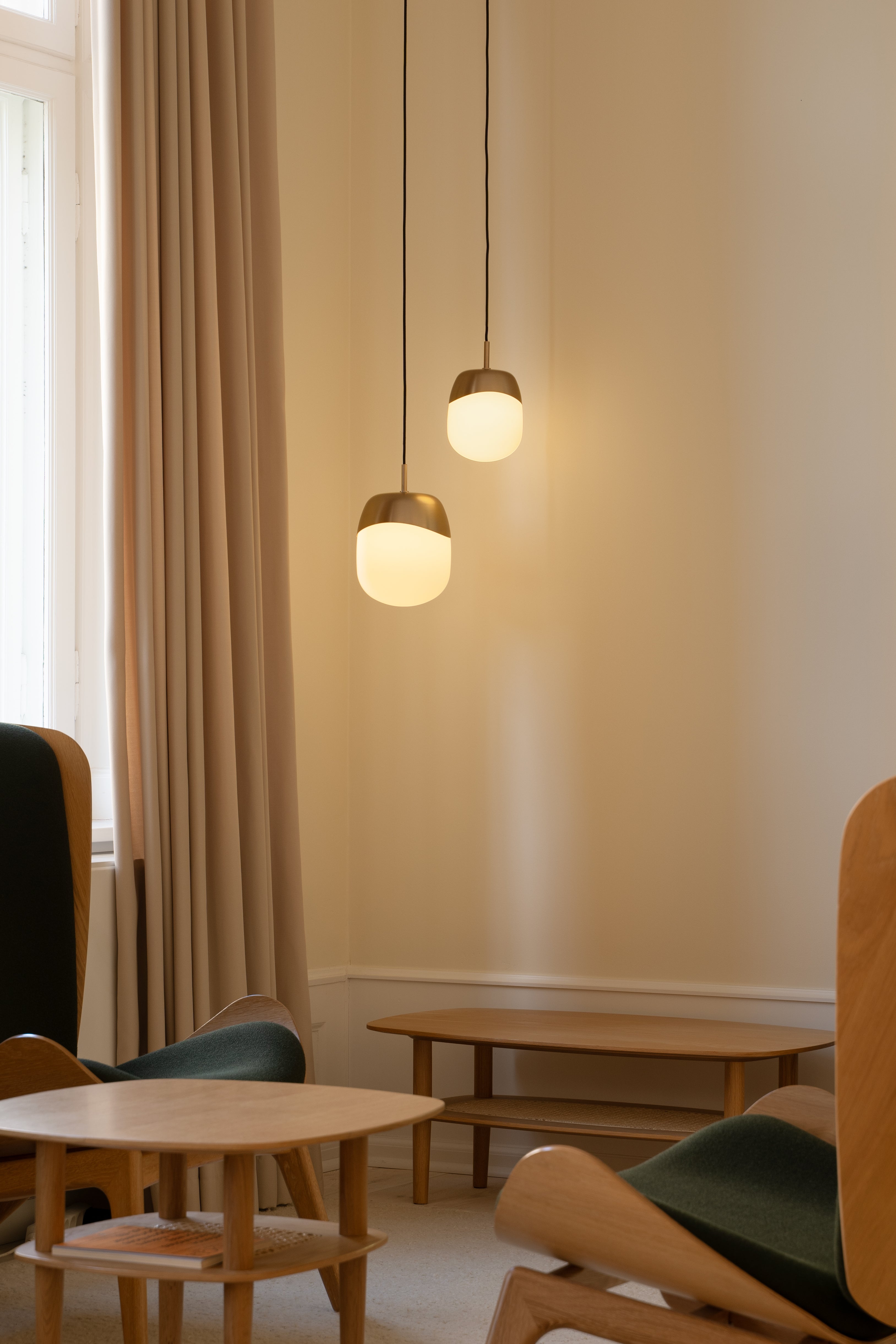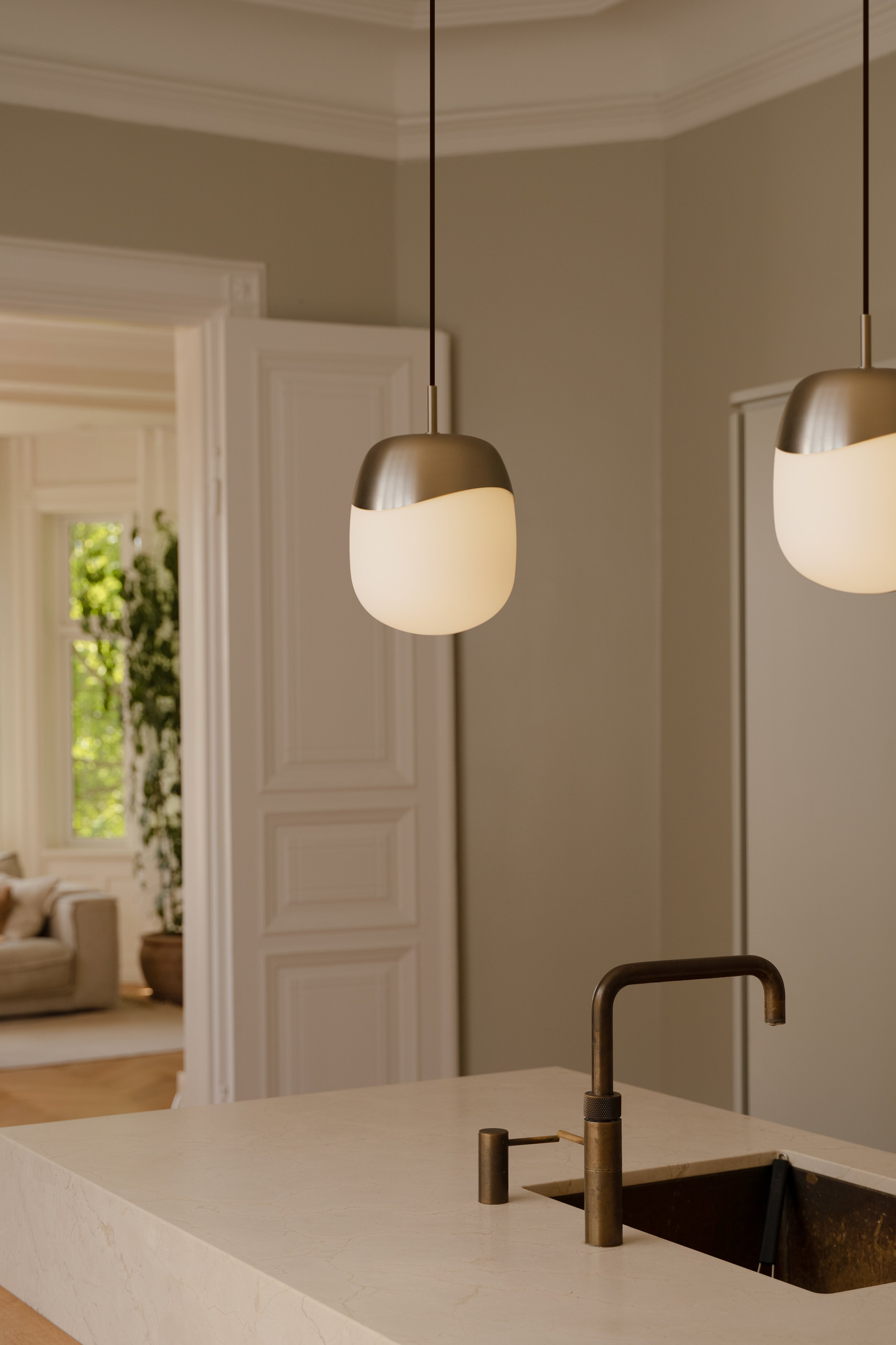 "Soft, milky glass and warm brass meet in subtly asymmetrical forms, evoking the lightness and renewal of spring."
