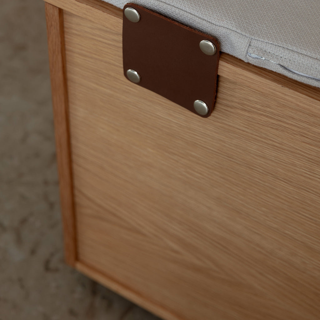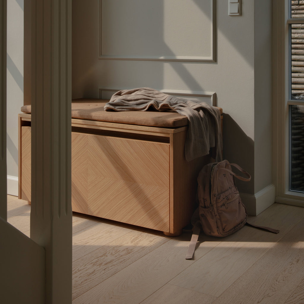 Crafted from oak, Hideaway combines clean lines and natural materials with everyday functionality. Its simple expression makes it a seamless fit for both modern and classic interiors. With durable construction and a design that balances storage with seating, Hideaway brings both order and comfort to the home, making every space more organised and welcoming.