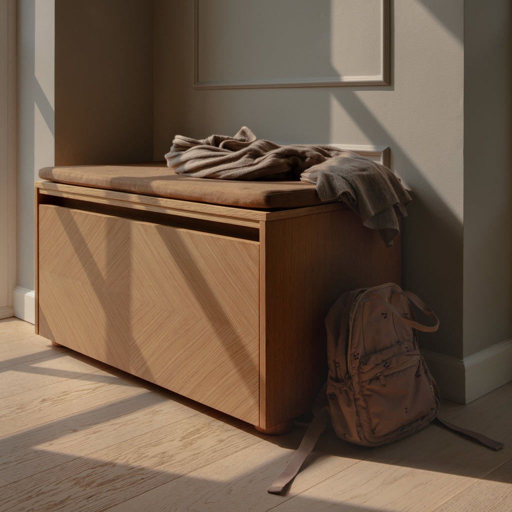 Hideaway combines timeless design with everyday functionality, offering storage and seating in one elegant piece. Crafted from oak and available with customisable fronts and cushions, it adapts easily to hallways, living rooms, or children’s rooms—whether as a shoe bench, reading nook, TV unit, or discreet cabinet.