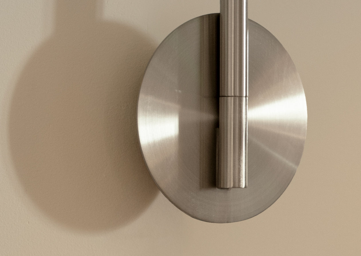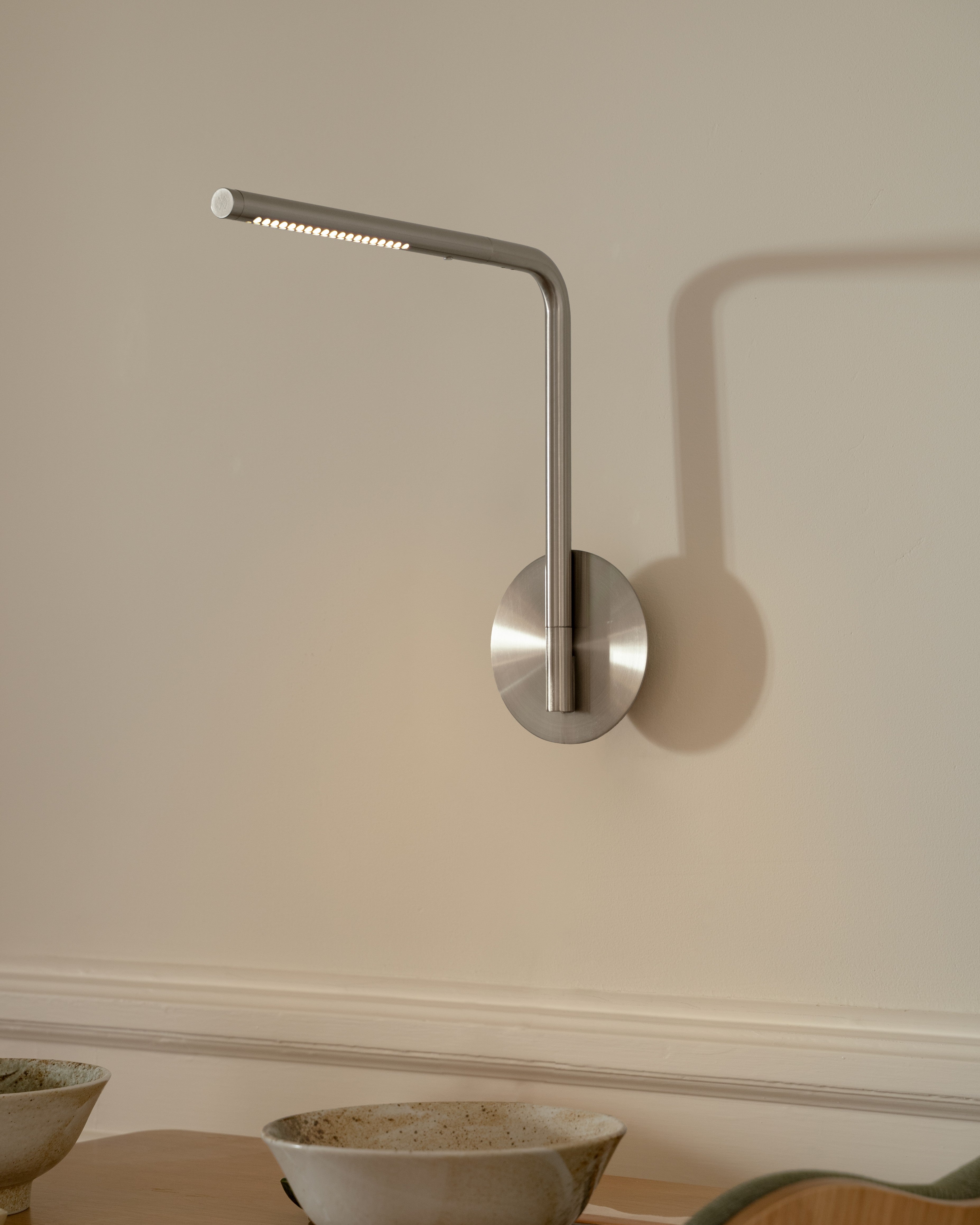 The lamp’s stem extends from the wall, offering a distinctive profile, while the light element can be rotated and the stem adjusted, allowing illumination to be directed exactly where it is needed.