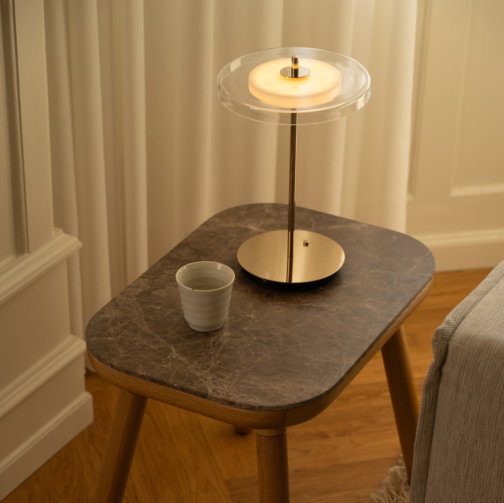 Blending cordless flexibility with contemporary elegance, the Asteria Move Glass adds a new lightness to the Asteria collection. Its transparent glass shade and sculptural diffuser create a soft, ambient glow across four brightness levels, while polished brass or steel accents complete the refined design. Portable and versatile, it brings atmosphere and sophistication to any space.