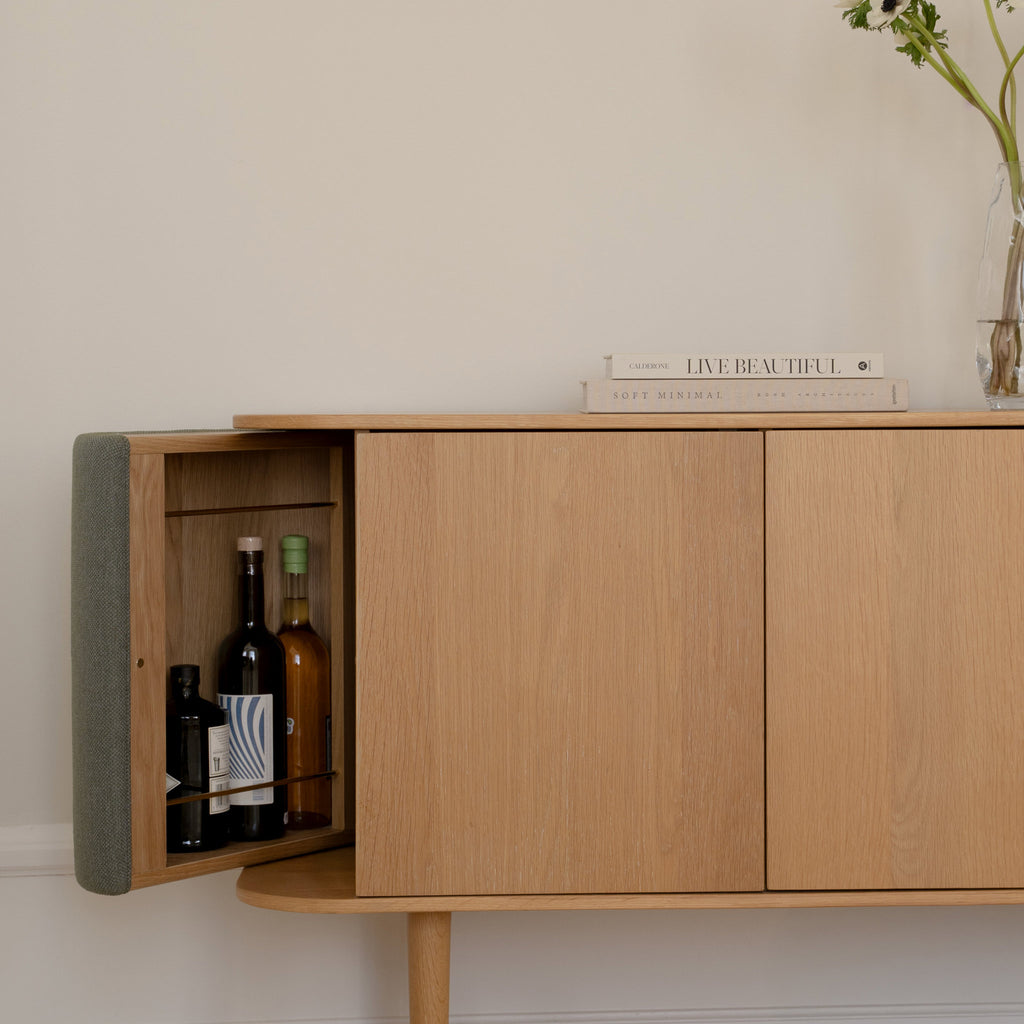 Treasures er et skreddersydd skap med et nordisk uttrykk. Skapet er laget av finert eiketre, og de buede sidene av skapet har et tilpassbart belegg...