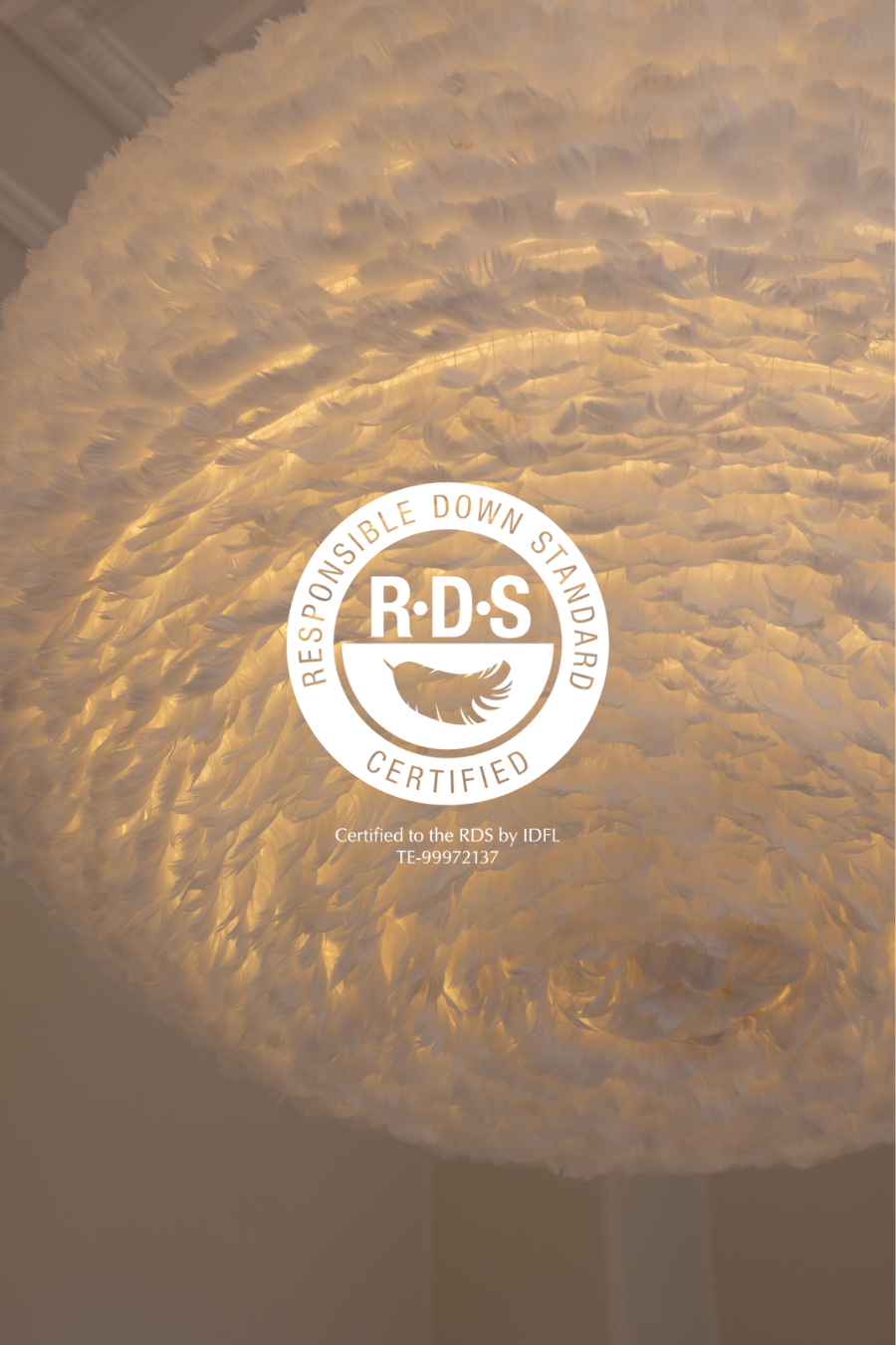 At UMAGE we ensure that all goose feathers used for our Eos feather lamp collection is 100% sustainably sourced from farmland to end-consumer. All feathers are licensed with an RDS certification, ensuring the well-being of animals in our production.  RDS stands for Responsible Down Standard and is an acknowledged certification in the industry of down and feathers. To receive this certification our entire product supply chain - from farmland to end consumer - has been audited, approved, and certified by IDFL, ensuring that all animals are treated with respect for the Five Freedoms of Animal welfare. In the sourcing of the feathers used in our Eos feather lamps, we are repurposing a by-product from the food industry. Goose feathers that would otherwise be burned and wasted are instead sanitized and repurposed, thus diminishing the environmental impact. With products certified with the Responsible Down Standard you’re ensured that no live-plucking or force feeding has taken place.