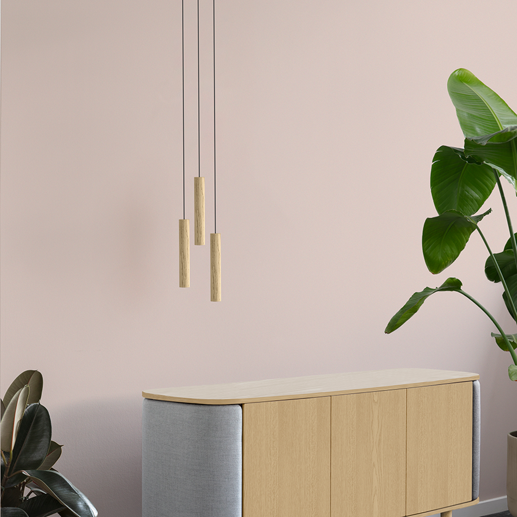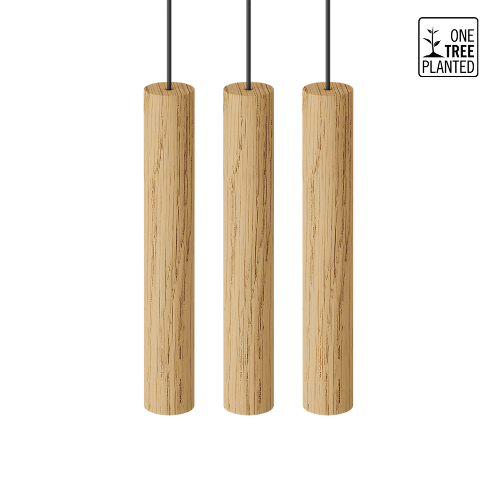 The Chimes lamp in a cluster model consisting of three Chimes hanging from a black metal canopy. The simple piece of solid oak infused with...